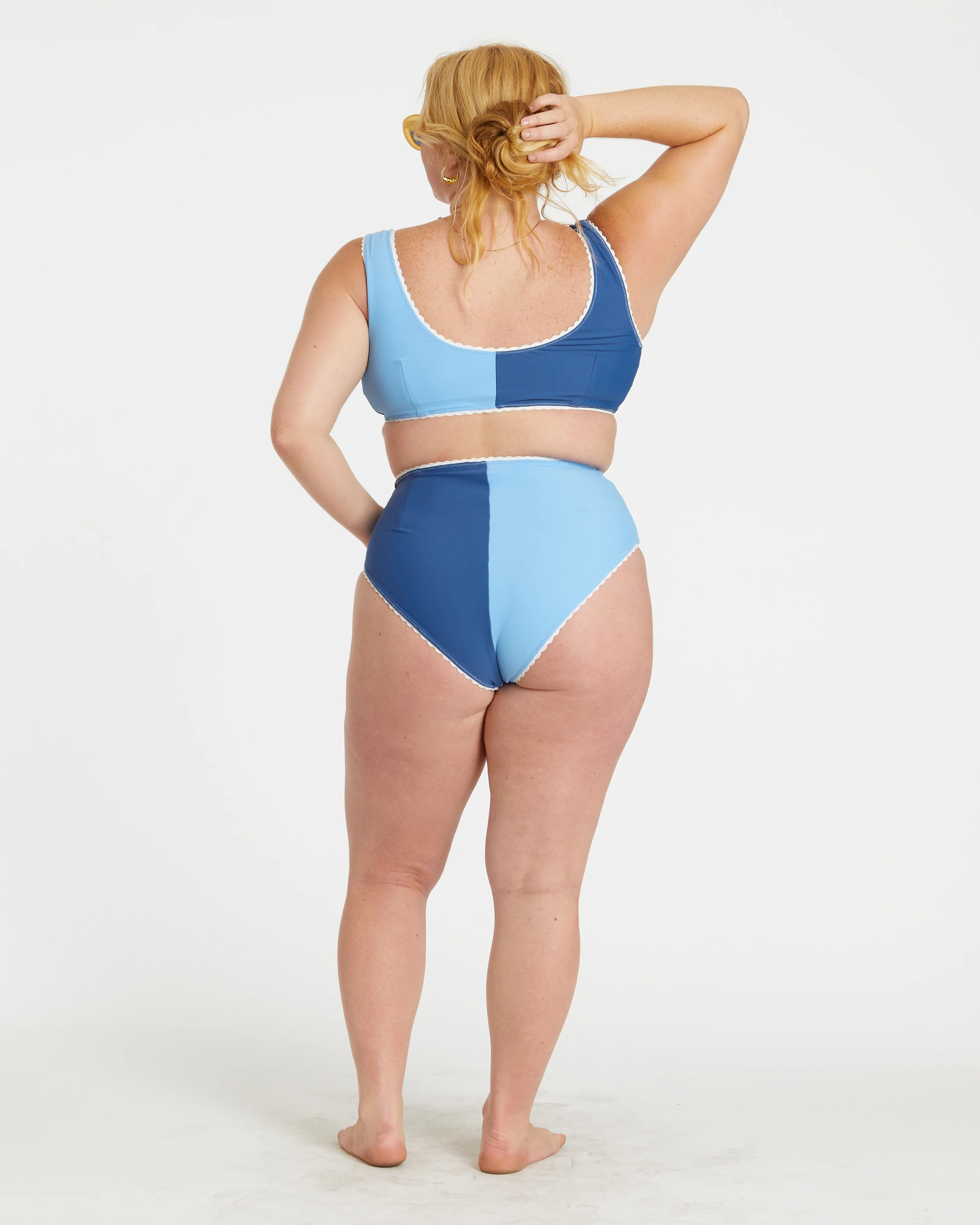 The Hammies Bikini is based on one of the original bikini styles from the 1960s. It combines elements from a couple of our favorite vintage finds, such as white rick rack trim, faux button closure in the back of the top, darts, and a vertical two-tone colorway. The body and rick rack are made with 15% stretch to accommodate bodies of all shapes and sizes. The buttons and white contrasting trim match the details of our Smock and Cabana Set and really complete that mid-century look.