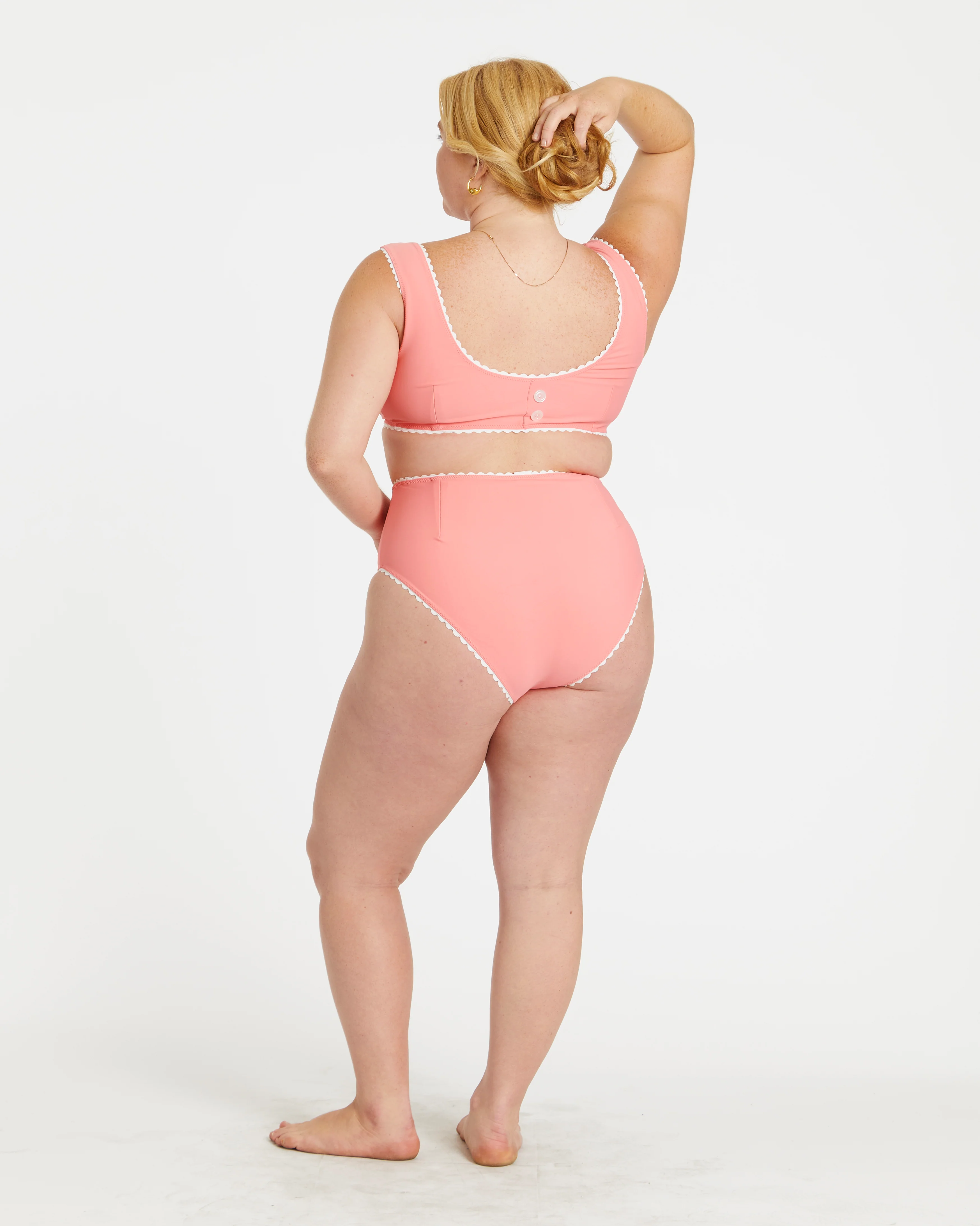 The Hammies Bikini is based on one of the original bikini styles from the 1960s. It combines elements from a couple of our favorite vintage finds, such as white rick rack trim, faux button closure in the back of the top, darts, and a vertical two-tone colorway. The body and rick rack are made with 15% stretch to accommodate bodies of all shapes and sizes. The buttons and white contrasting trim match the details of our Smock and Cabana Set and really complete that mid-century look.