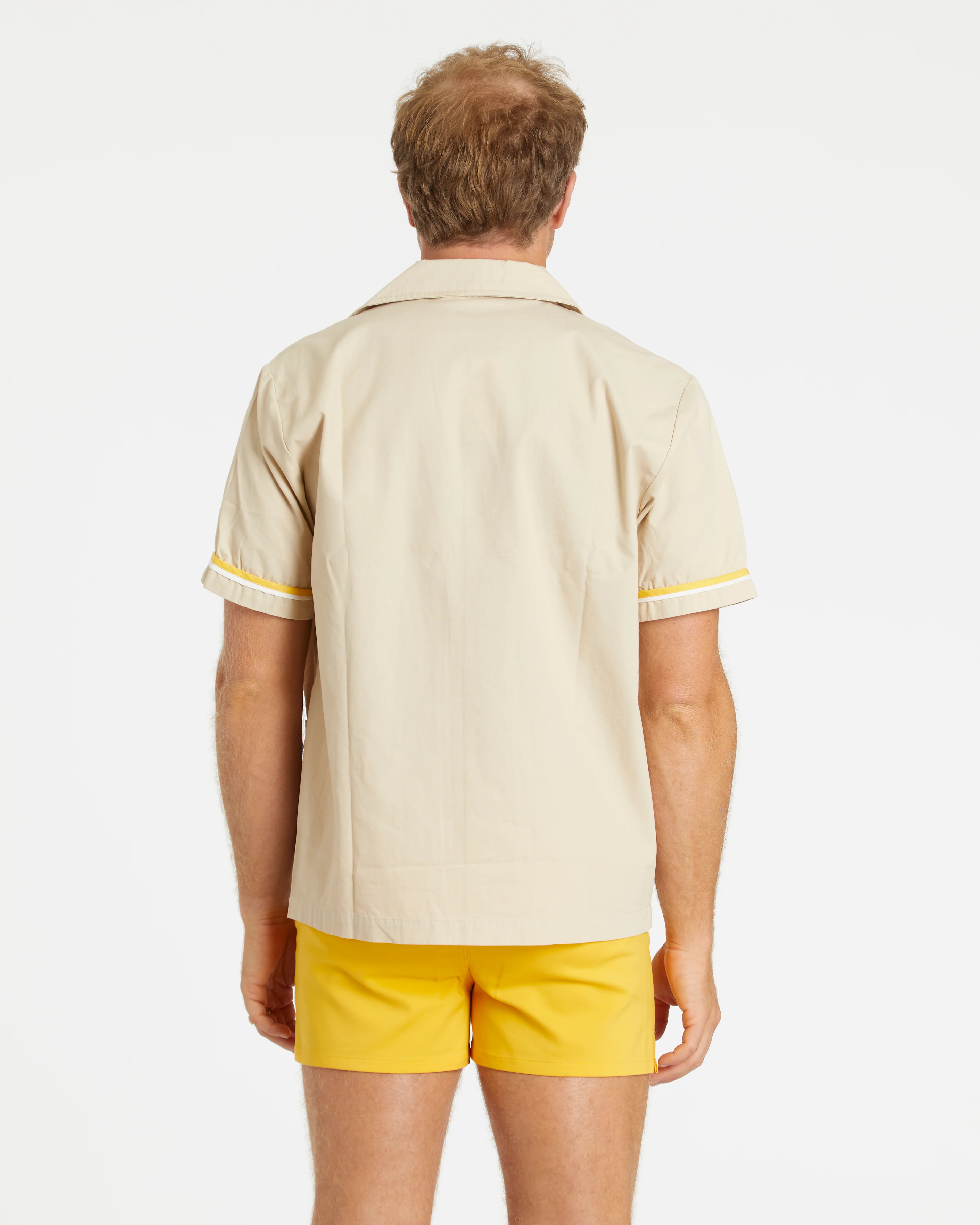 TheĀ shirt design isĀ 100% true to its origins. The most iconic feature of the cabana shirt is the two cabana pockets on the front with contrasting trim. Like the original, it has a wide and short fit and oversized collar. It comes in three colorways (White/Navy/Red, Sand/Rust/White, and Sand/Gold/White)Ā to match our four CabanaĀ Trunk colors (navy, red, rust, and gold). The contentĀ is 100% cotton and then trim is borrowed from the trunks to match the colors perfectly.Ā